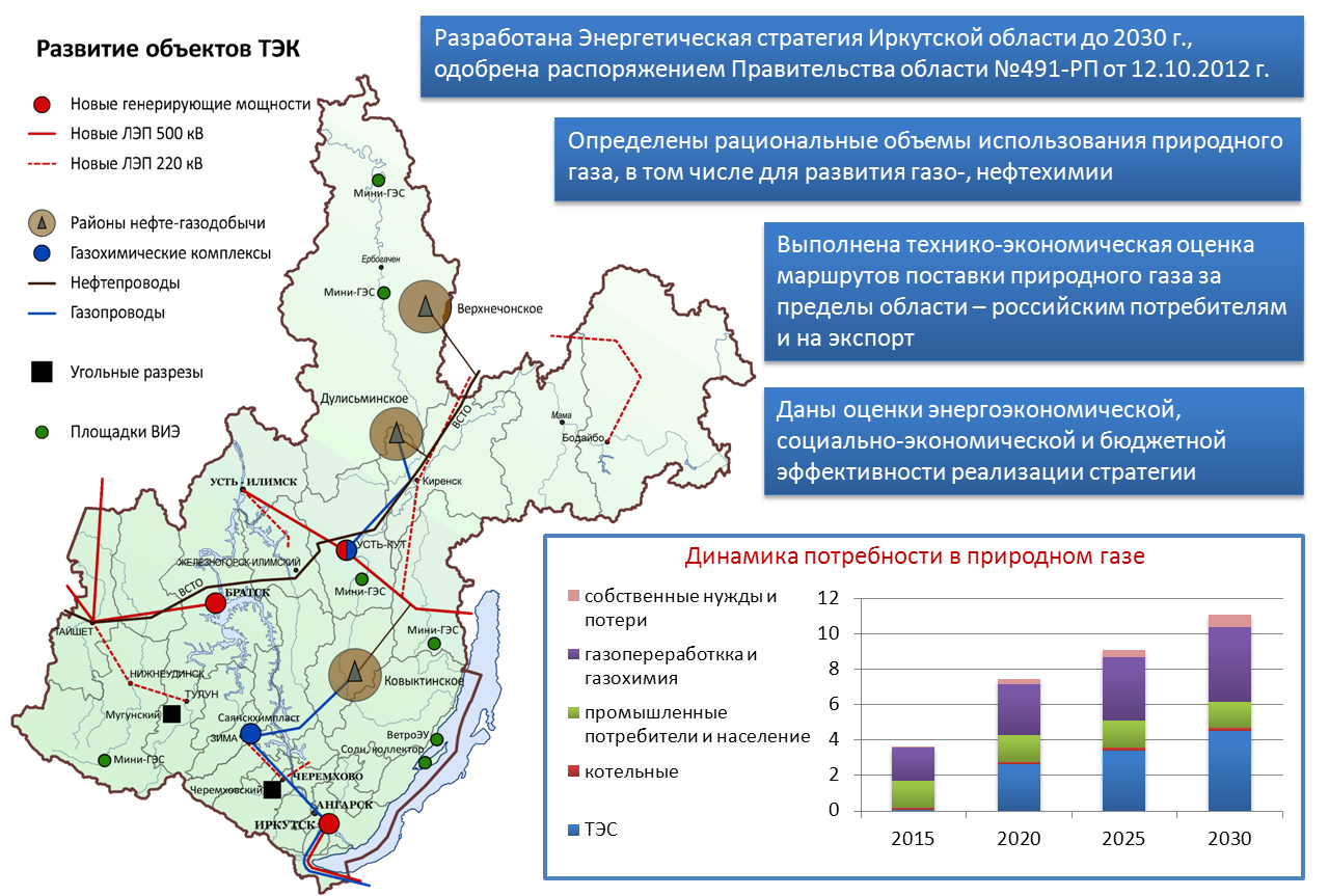 Исходя из условий межтопливной конкуренции у различных категорий потребителей, определены рациональные объемы использования природного газа, в том числе для развития нефте- и газохимической промышленности. К 2030 году потребность в природном газе в Иркутской области может возрасти до 9-11 млрд. м3.